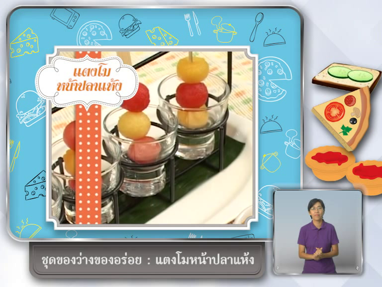 ภาพประกอบวีดิทัศน์รายการโทรทัศน์เพื่อการศึกษาและการส่งเสริมอาชีพ สำหรับบุคคลที่มีความบกพร่องทางการได้ยิน (มีภาษามือ)ทำกินก็ได้ ทำขายก็ดี ชุด ของว่าง ของอร่อย ตอนที่ 3 แตงโมหน้าปลาแห้ง